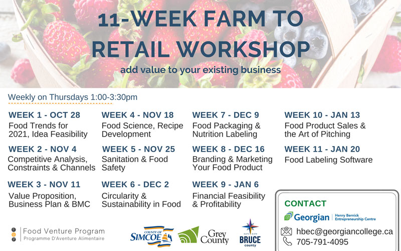 Simcoe County is partnering with the Counties of Grey and Bruce along with the Henry Bernick Entrepreneurship Centre to run a Farm to Retail 11-Week Workshop starting on October 28, 2021. The Workshop will help farmers take an idea and understand the process of developing it from ideology to finished product. The Workshop looks at health requirements, financing, consumer intelligence and more. The program is being organized and run by the Food Venture Program, who have worked on similar programs throughout Ontario. There will be a total of 21 places available (7 for each county). Applicants will have to apply to attend the program and a judging panel made up of the 4 CFDCs in Simcoe County will determine who from Simcoe County will participate.